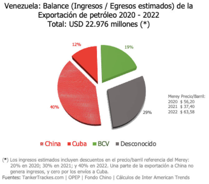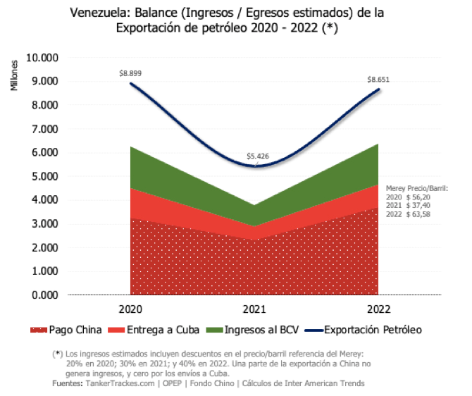 La premisa para los cálculos es: envíos a Cuba y China (BDC) de acuerdo con TankerTrackers.com; precio del barril de Merey promedio año según la OPEP; volumen de exportación remanente tiene un descuento de 20% en 2020, 30% en 2021 y 40% en 2022.